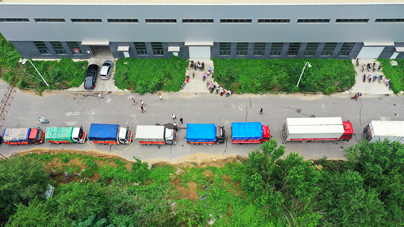 在河北省涿州市钢研物资储备点外,运送物资的车辆排起长队(8月5日摄,无人机照片)。新华社记者 牟宇 摄